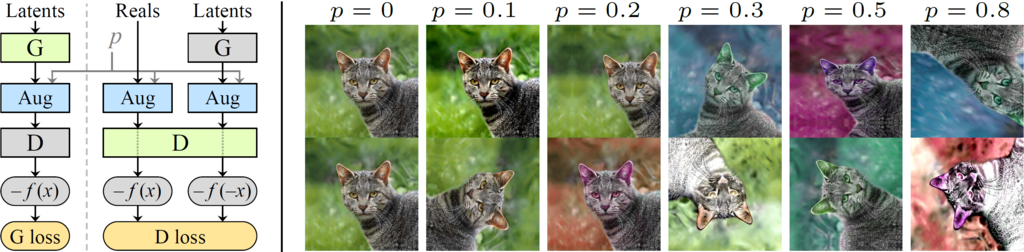 Using too little data typically leads to discriminator overfitting, causing training to diverge. So the NVIDIA team proposed an adaptive discriminator augmentation mechanism that significantly stabilizes training in limited data regimes. The approach does not require changes to loss functions or network architectures, and code almost looks the same, therefore it can be used in your existing StyleGANv2 projects. It is applicable both for training from scratch and fine-tuning an existing GAN on another dataset.