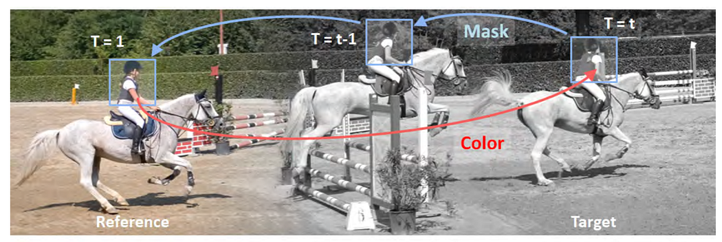 SONY proposed a novel reference-based video colorization framework with spatiotemporal correspondence. Reference-based methods colorize grayscale frames referencing a user input color frame. Previously released methods suffer from the color leakage between objects and the emergence of average colors, derived from non-local semantic correspondence in space. To address this issue, SONY warp colors only from the regions on the reference frame restricted by correspondence in time. They propagate masks as temporal correspondences, using two complementary tracking approaches: off-the-shelf instance tracking for high-performance segmentation and newly proposed dense tracking to track various types of objects.
