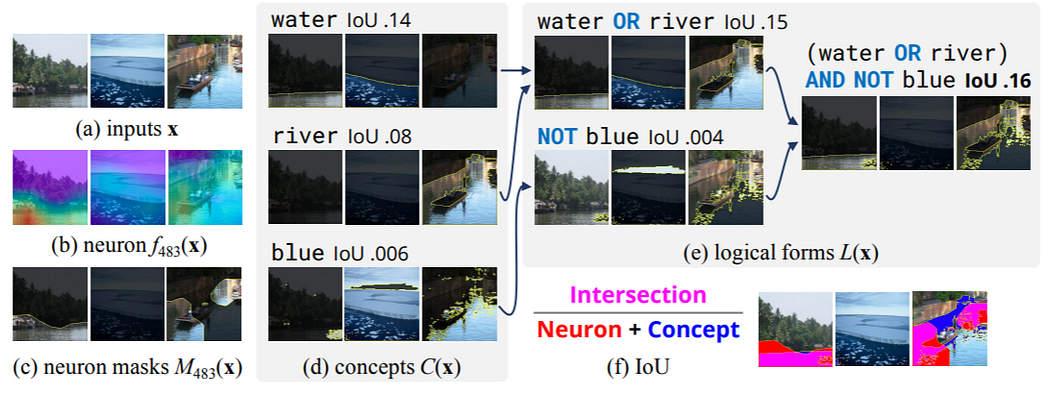 Researchers given a set of inputs (a) and scalar neuron activations (b) converted into binary masks (c), generate an explanation via beam search, starting with an inventory of primitive concepts (d), then incrementally building up more complex logical forms (e). They attempt to maximize the IoU score of an explanation (f); depicted is the IoU of M483(x) and (water OR river) AND NOT blue.