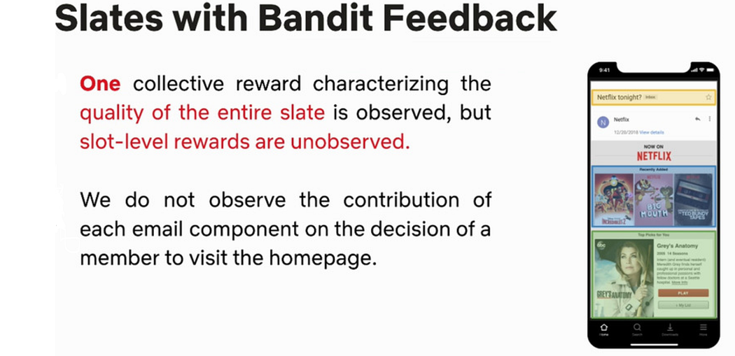 NETFLIX’s talk is about applying Reinforcement Learning and Bandits to the marketing problem of the designing email interfaces. This approach can be applied to any other tasks when some application has UI (User Interface) slots that need to be filled in with different buttons or functional regions that require actions from users.